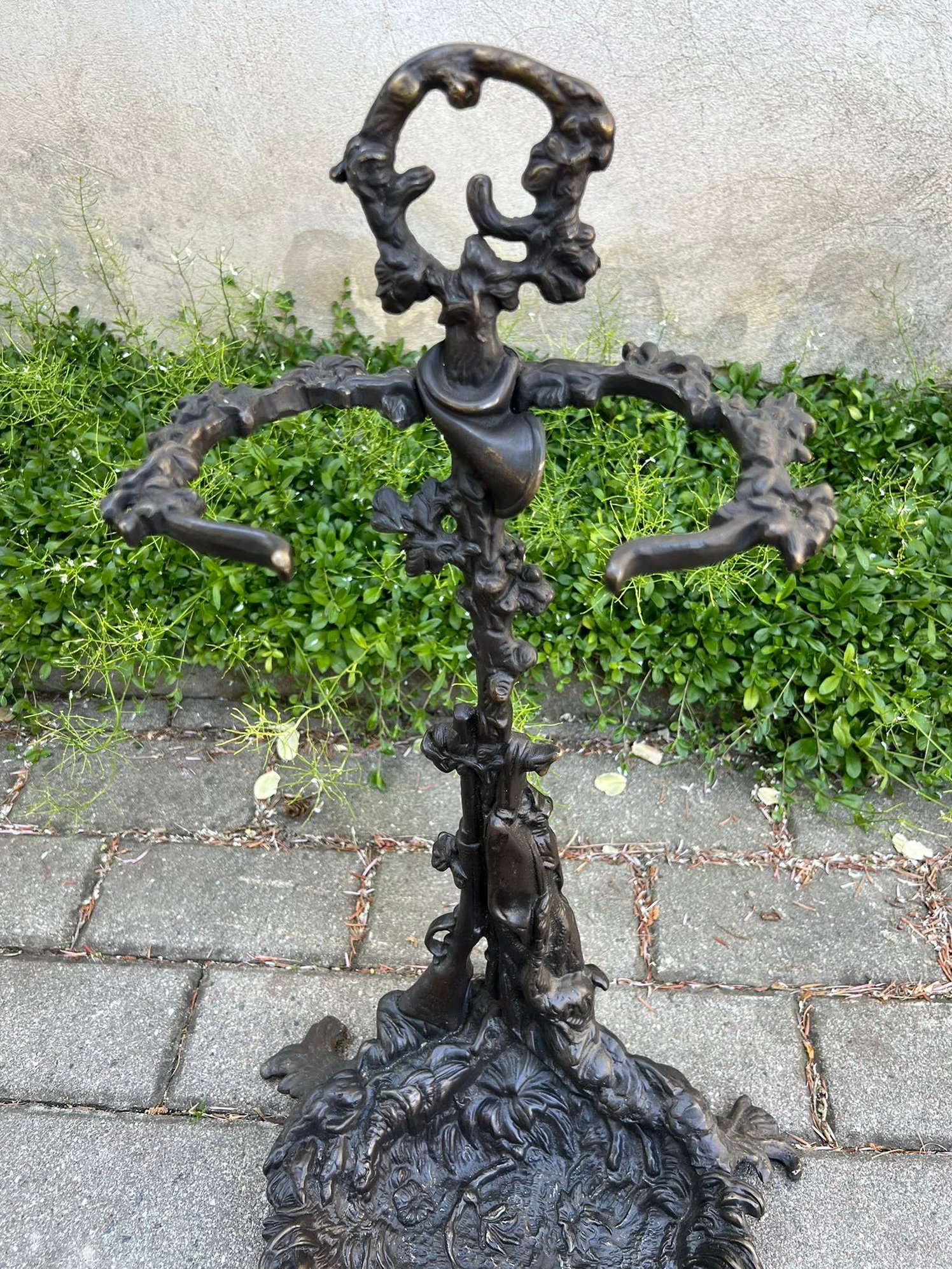 Židinio įrankių komplektas su stovu, bronziniai, medžioklės motyvais. Nenaudoti. Svoris 8,9 kg. Stovo aukštis 55, plotis 24, pagrindo plotis 34 cm. Kaina 258