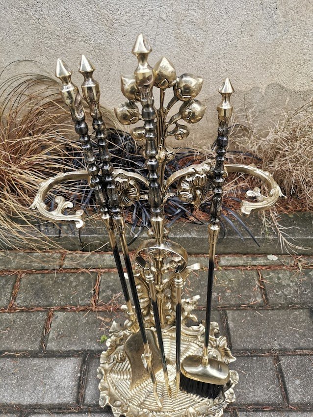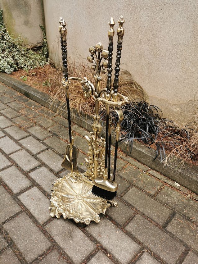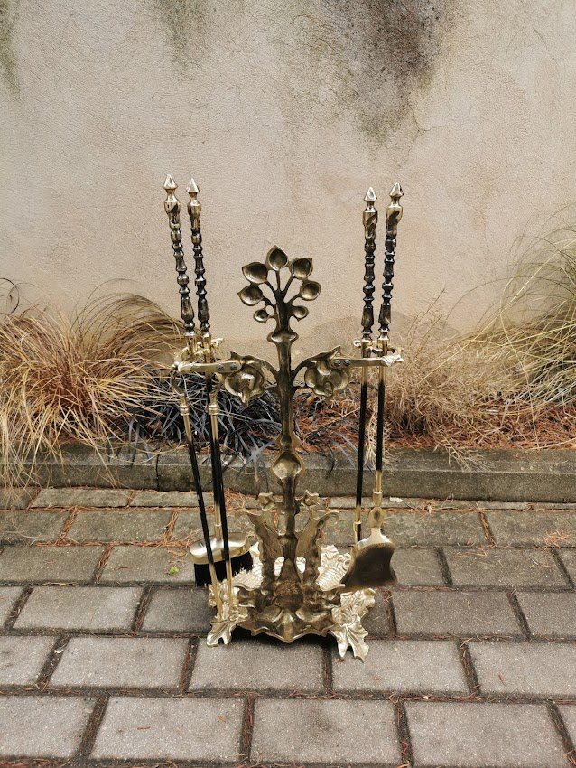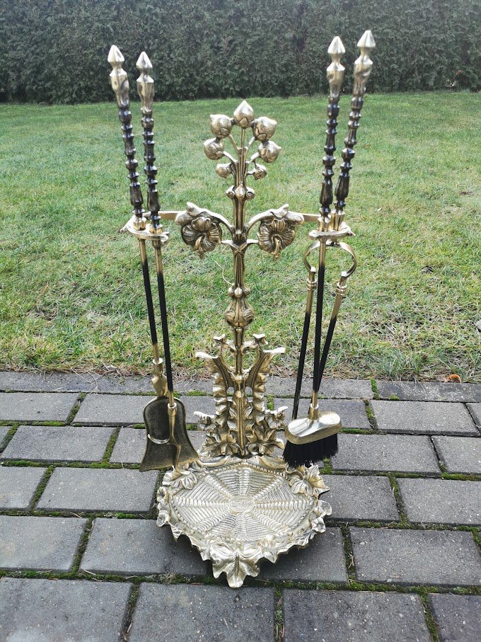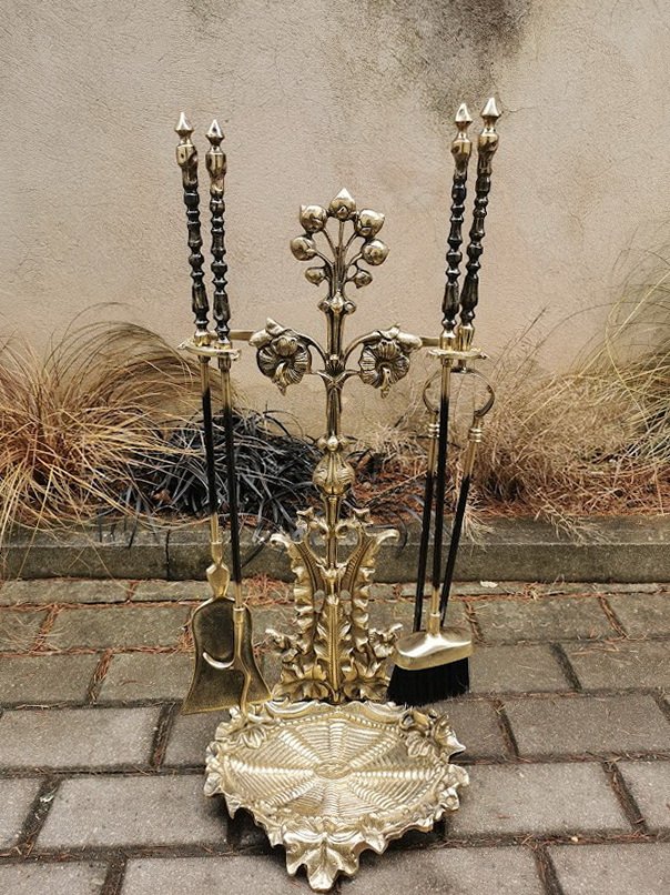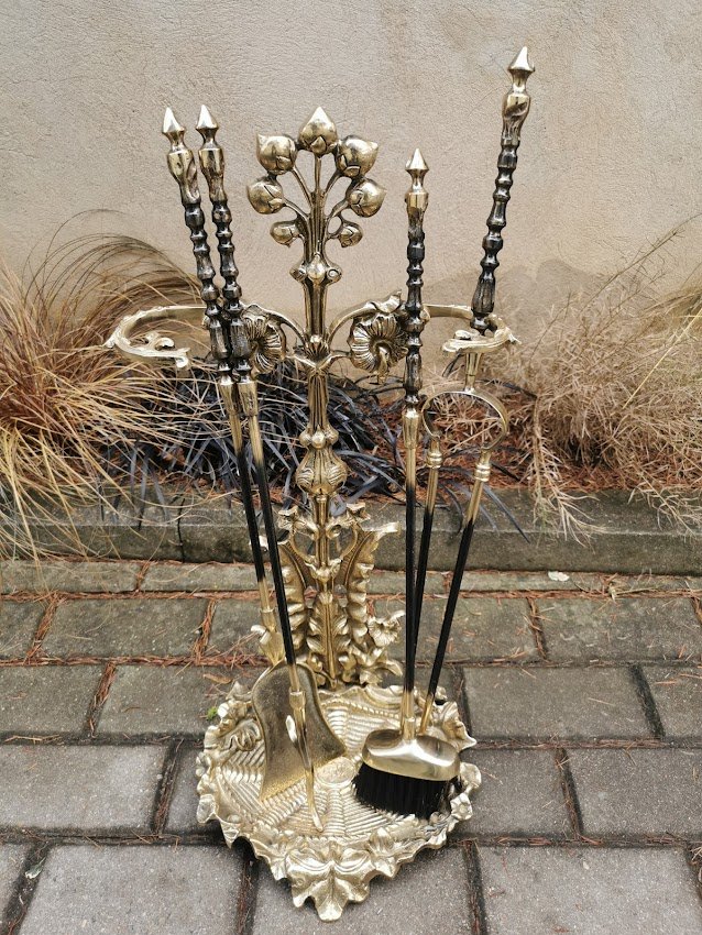 Židinio įrankių komplektas su stovu, bronziniai. Svoris 6,6 kg. Kaina 268
