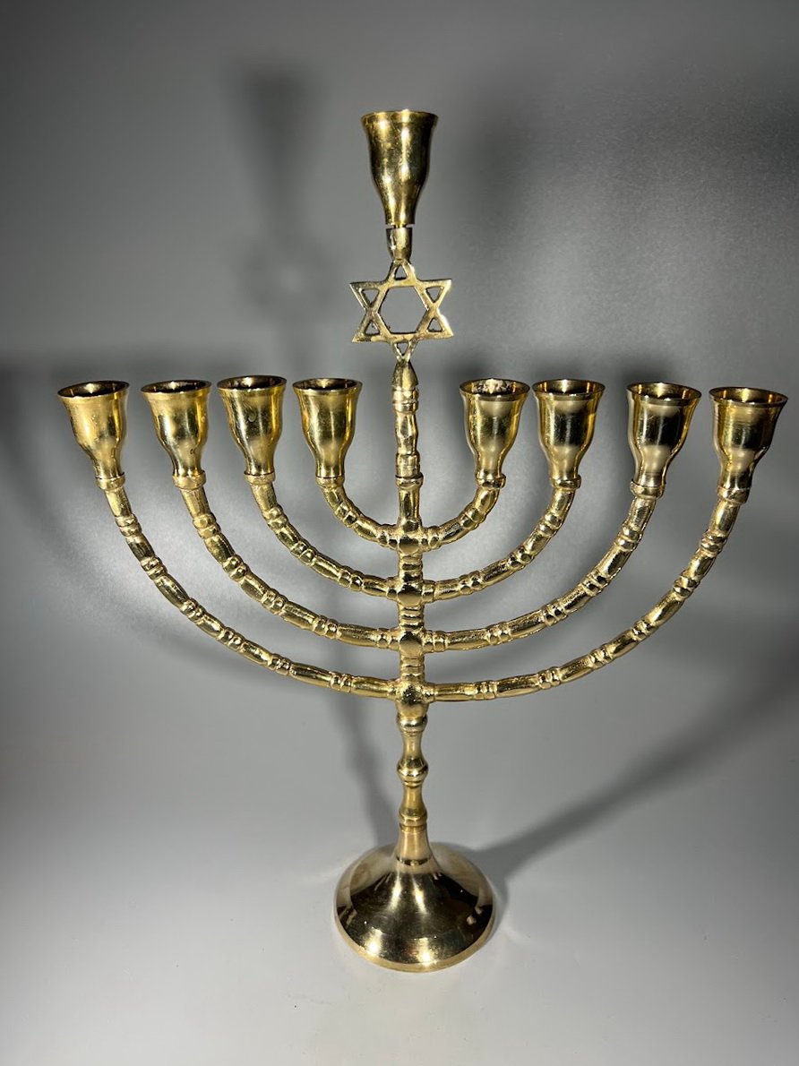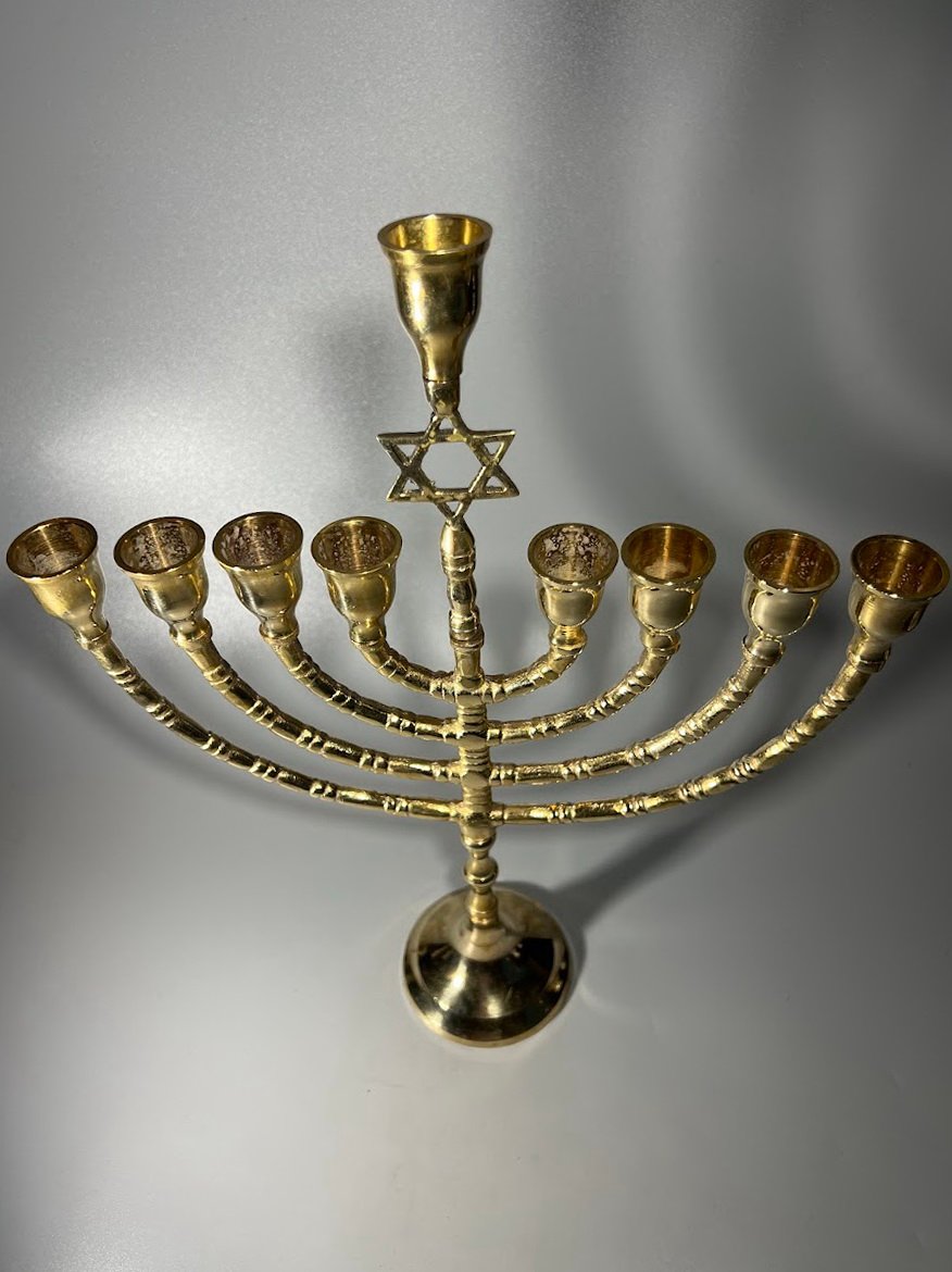 Žvakidė chanukija, šventinė menora, devynšakė, bronzinė. Svoris 1 kg. Aukštis 37, plotis 29 cm. Kaina 193