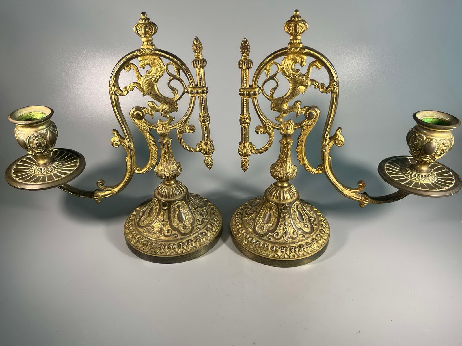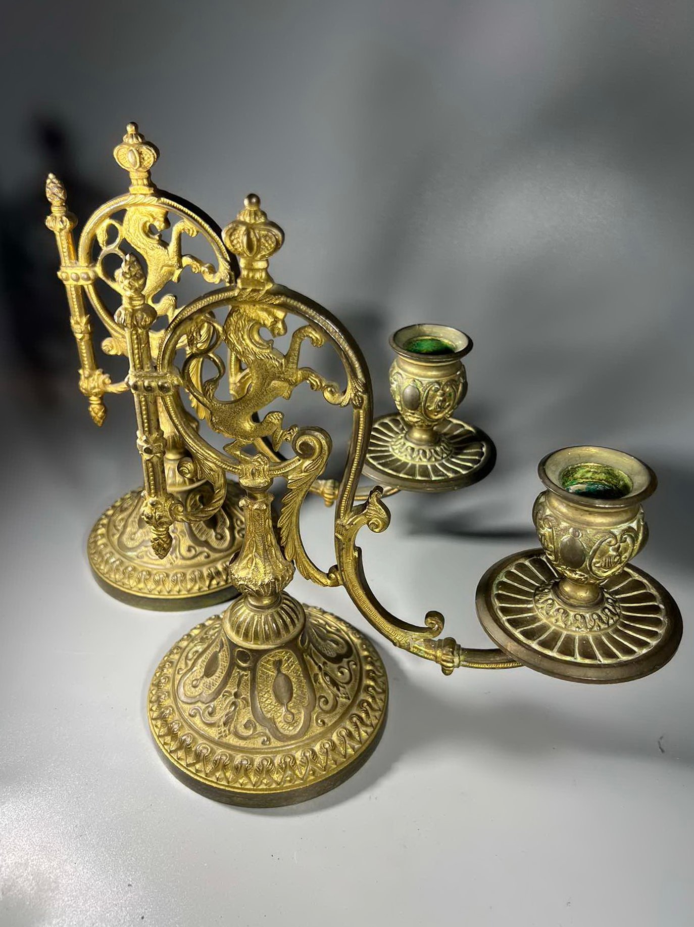 Žvakidė, žvakidės antikvarinės, bronzinės, prancūziškos. L. Pinet. Depose. LIKO VIENA. Vienos svoris 1,8 kg. Aukštis 23, ilgis 21, pagrindo skersmuo 11 cm. Kaina 68