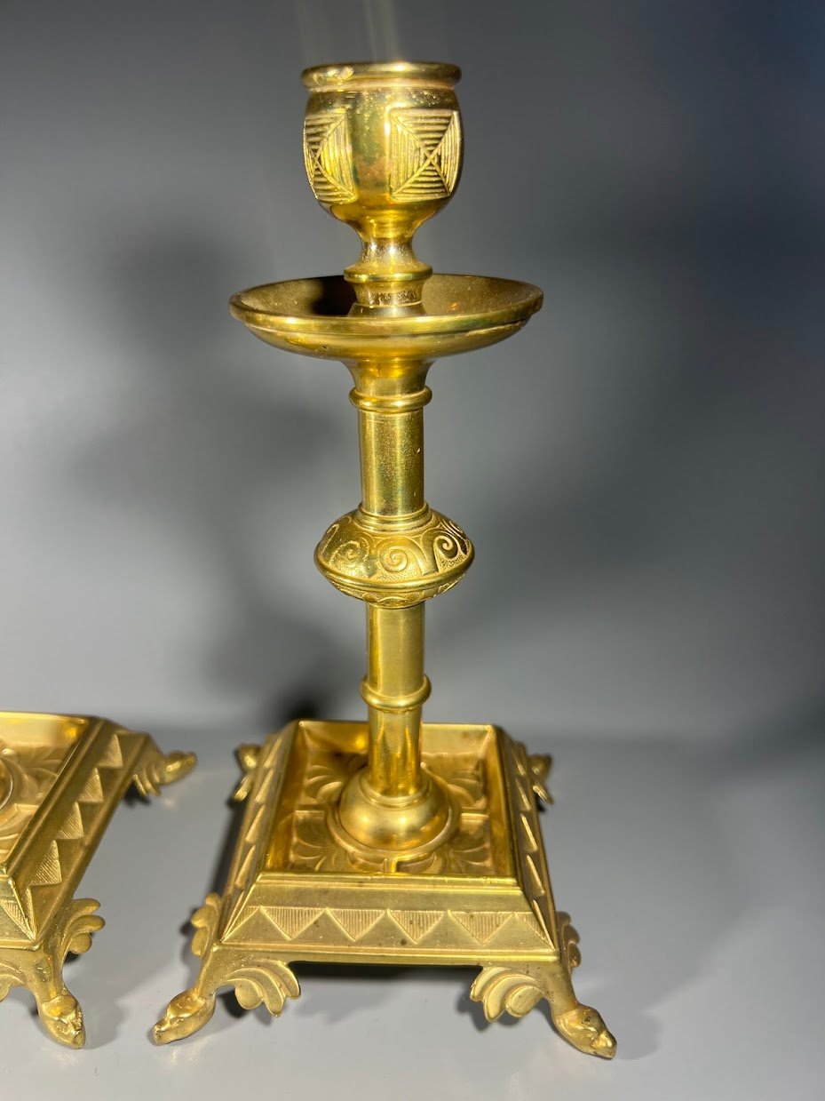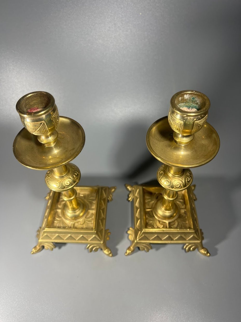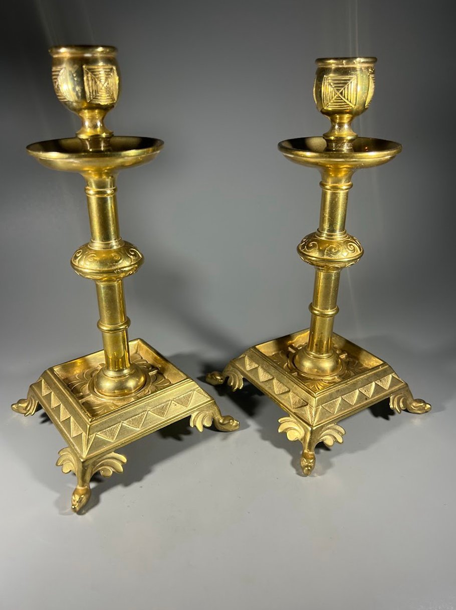 Antikvarinių žalvarinių žvakidžių pora su gausiai dekoruotomis detalėmis. Šie dirbiniai pasižymi kvadratiniu pagrindu su kojelėmis ir klasikiniais ornamentais, kurie būdingi XIX a. pabaigos ar XX a. pradžios stiliui.