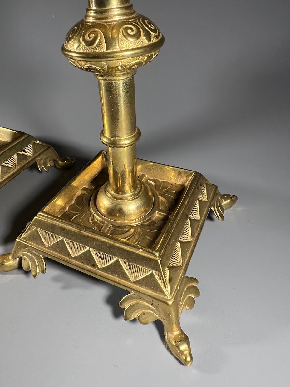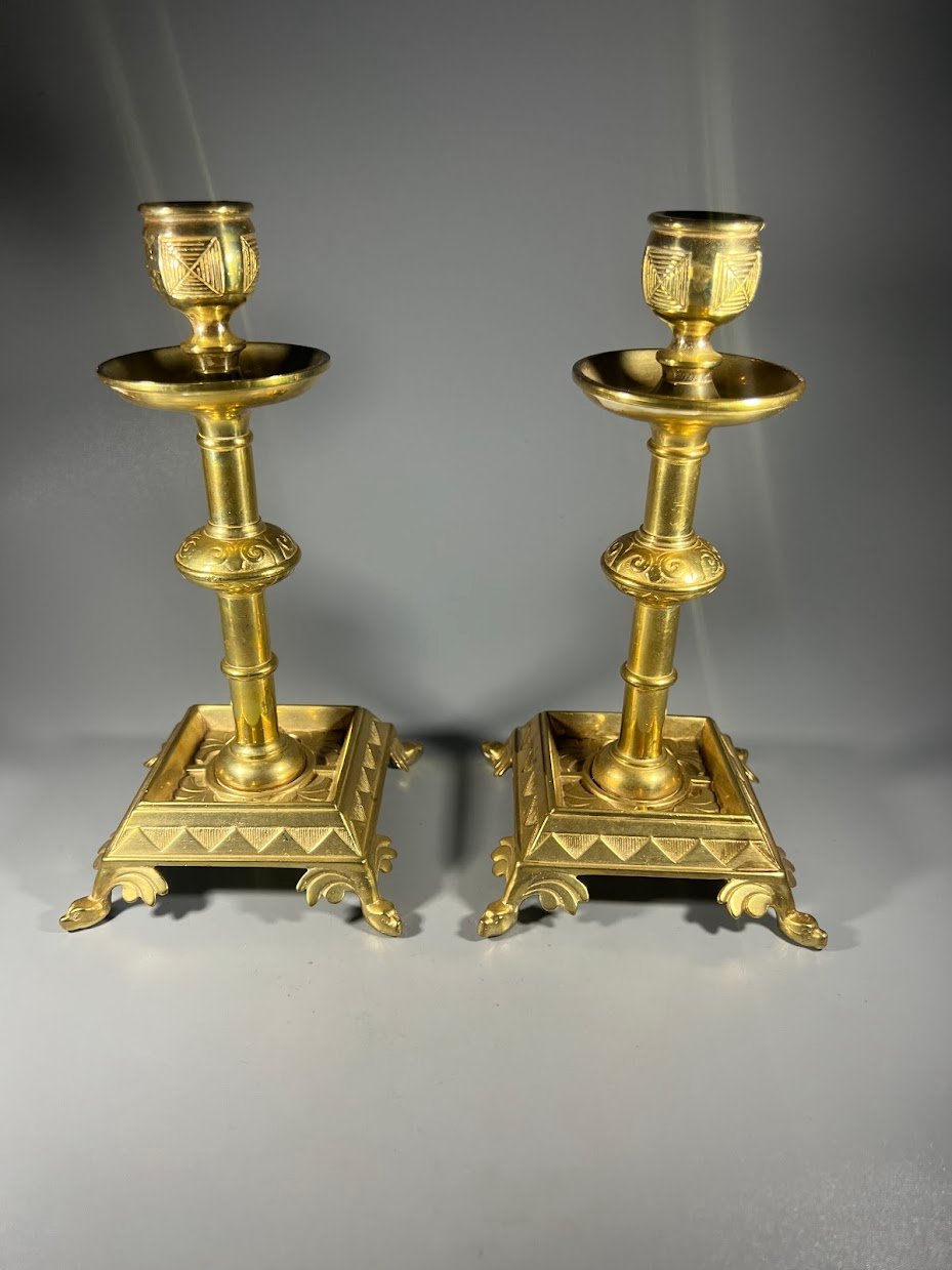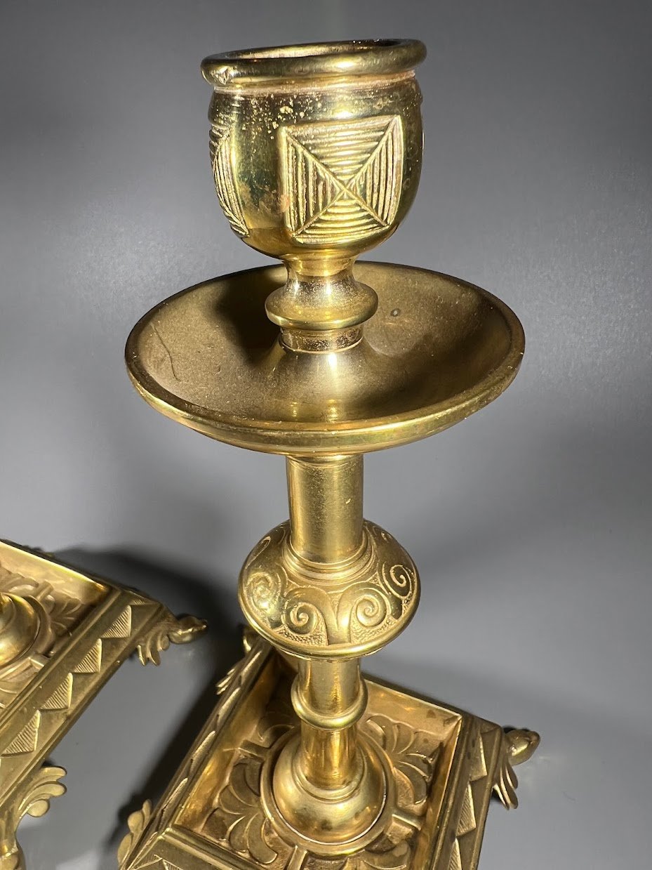 Antikvarinių žalvarinių žvakidžių pora su gausiai dekoruotomis detalėmis. Šie dirbiniai pasižymi kvadratiniu pagrindu su kojelėmis ir klasikiniais ornamentais, kurie būdingi XIX a. pabaigos ar XX a. pradžios stiliui.