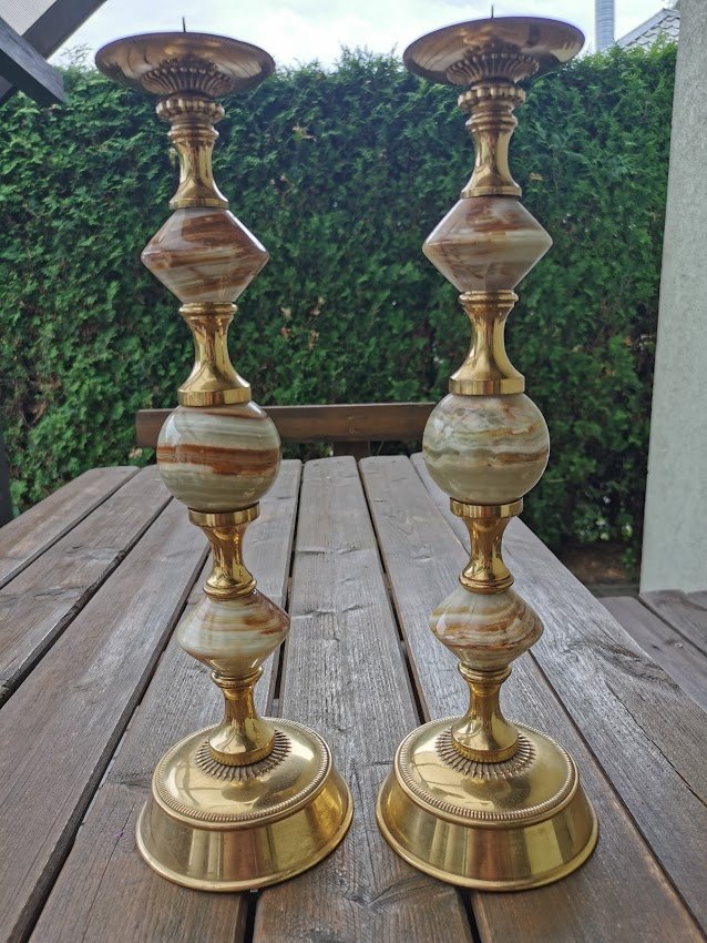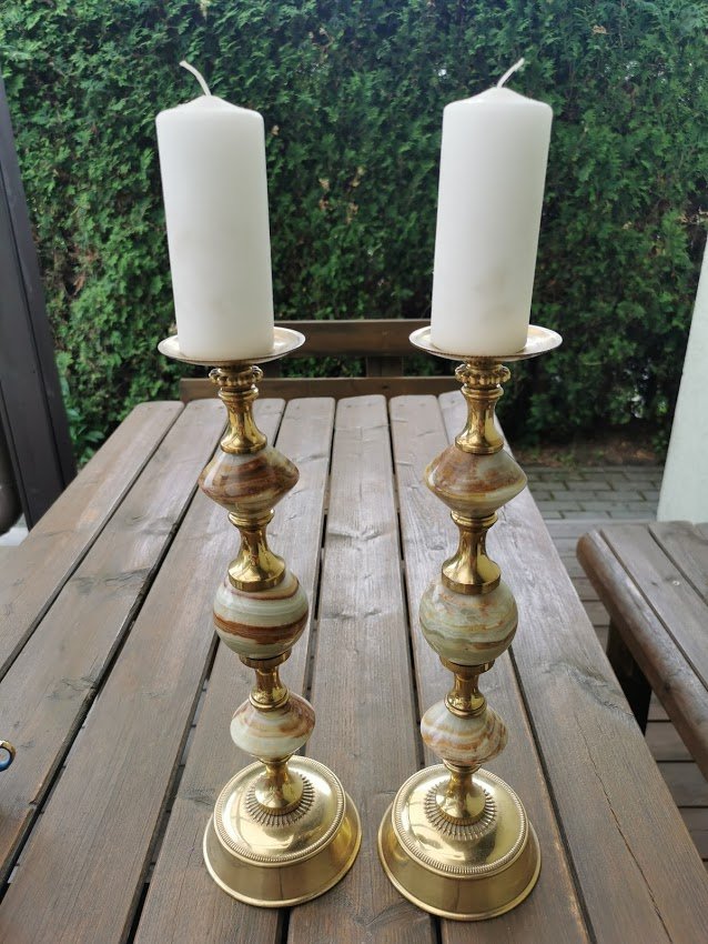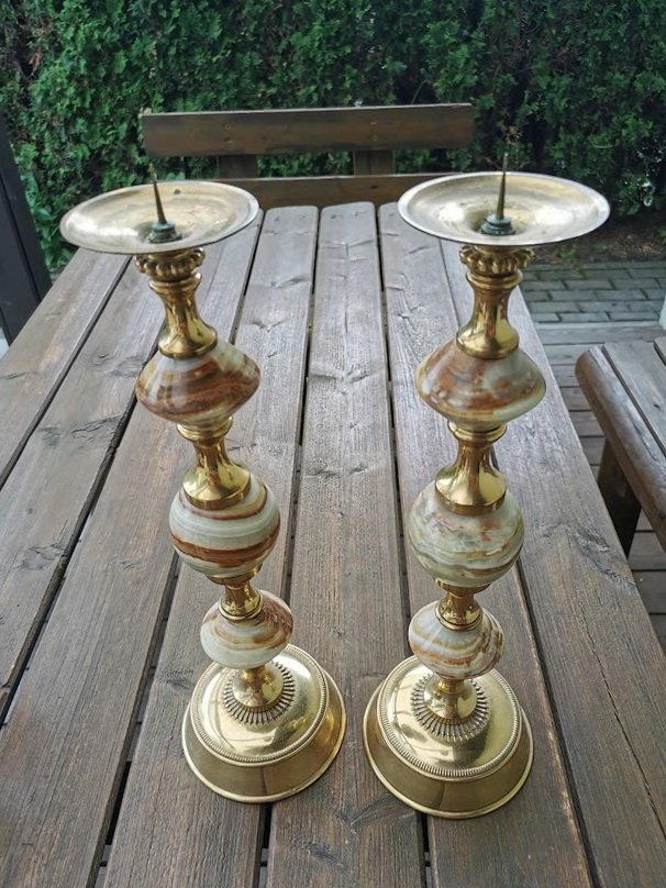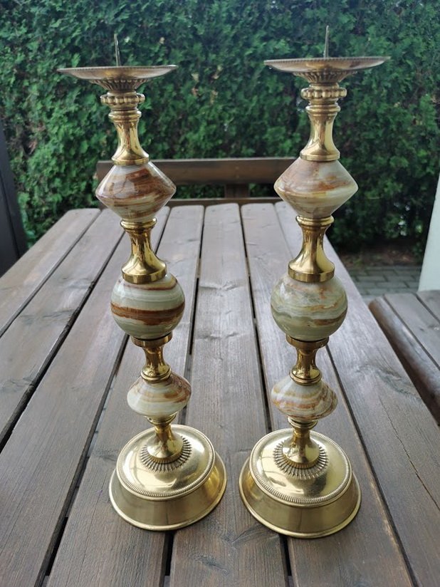 Žvakidės puoštos oniksu. Aukštis 40, pagrindo skersmuo 11,5 cm. LIKO VIENA. Kaina 48