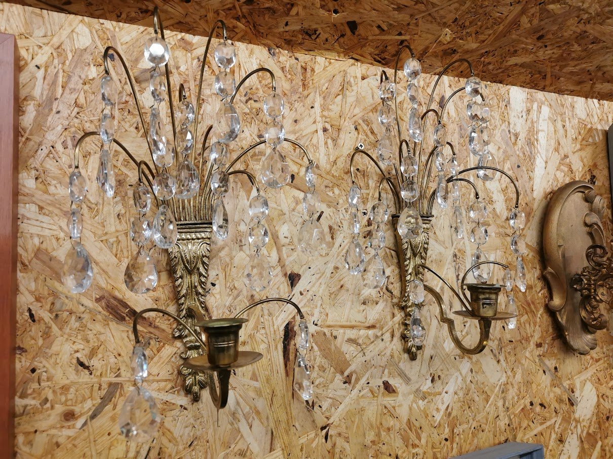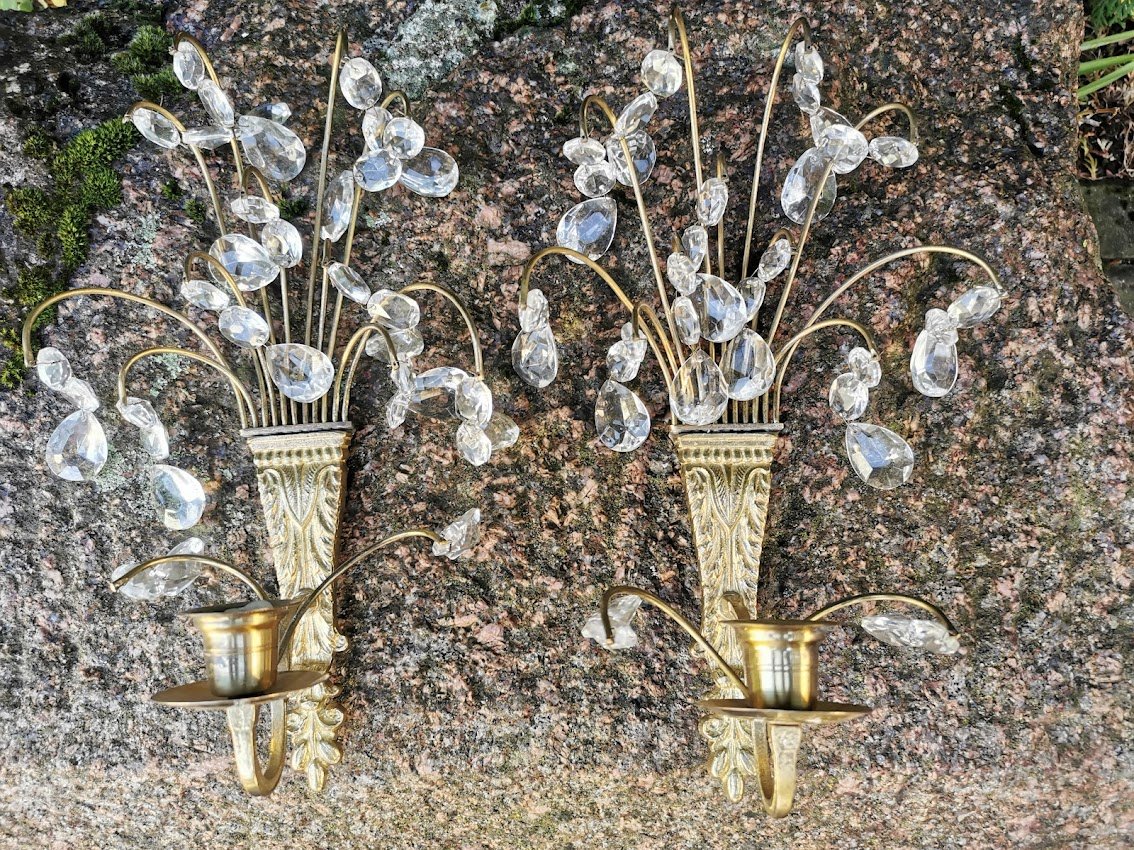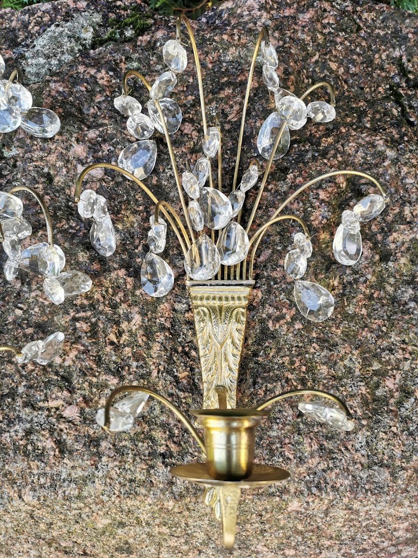 Žvakidės žalvarinės puoštos krištolu, antikvarinės. 2 vnt. Aukštis 32, plotis 17 cm. Kaina po 53