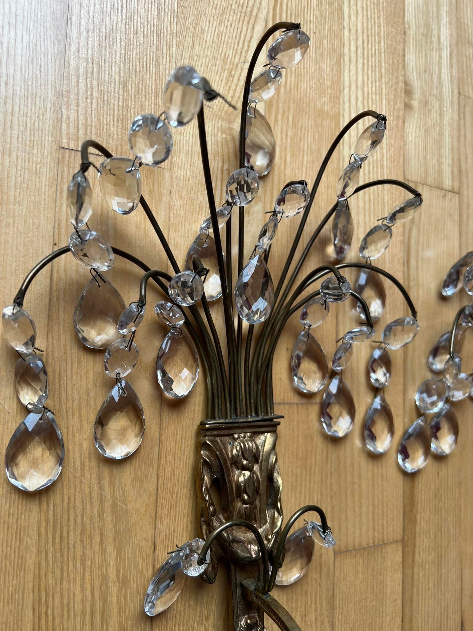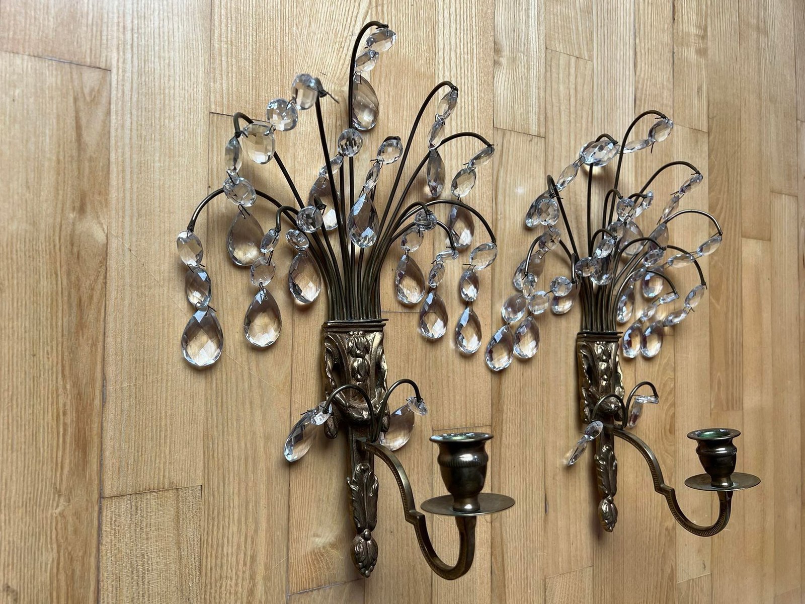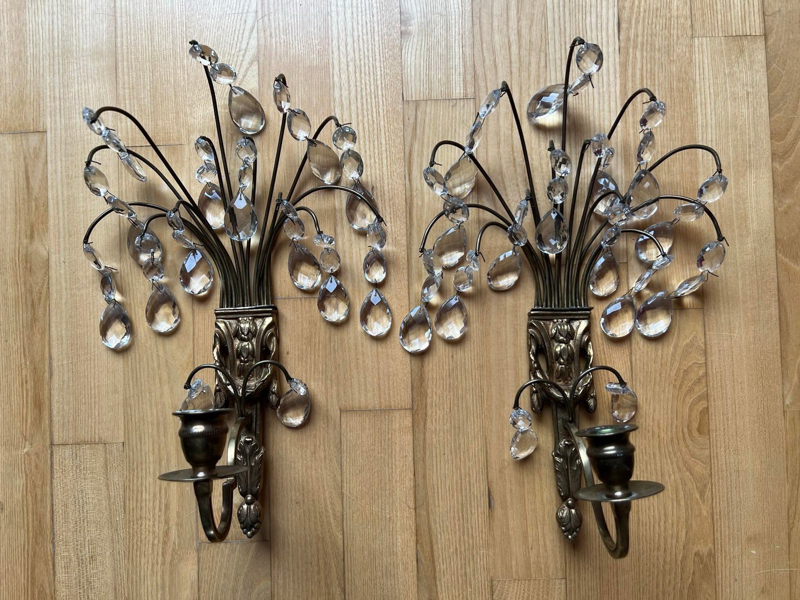 Žvakidės žalvarinės puoštos krištolu, antikvarinės. 2 vnt. Aukštis 32, plotis 17 cm. Kaina po 58
