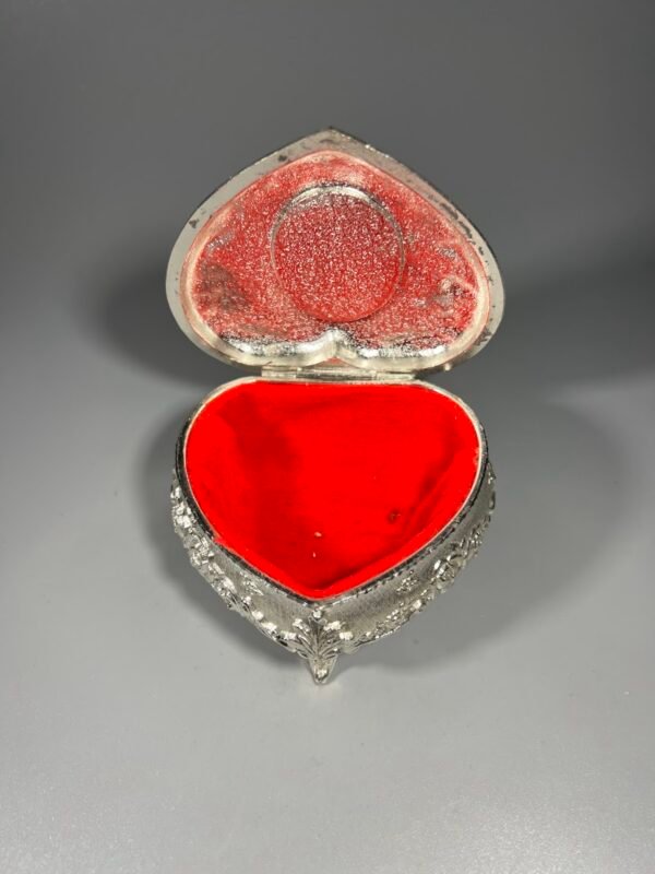 Dėžutė papuošalams metalinė, širdelės formos, dengta balta emale, japoniška. Aukštis 6, ilgis 9, plotis 8 cm. Kaina 26