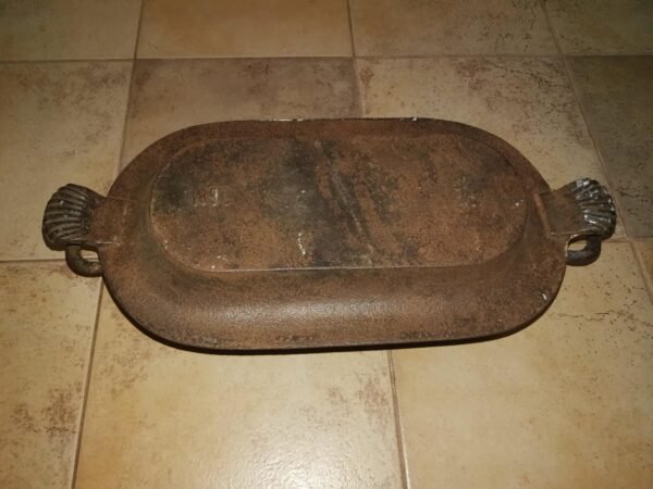 €72Troškintuvas ketaus (špižinis), Vidus geros būklės, neištrupėjęs. Ilgis su rankenomis 52, plotis 25 cm. aukštis 20 cm. Svoris 9,6 kg. Galimai pagamintas 1890 m. Kaina 72