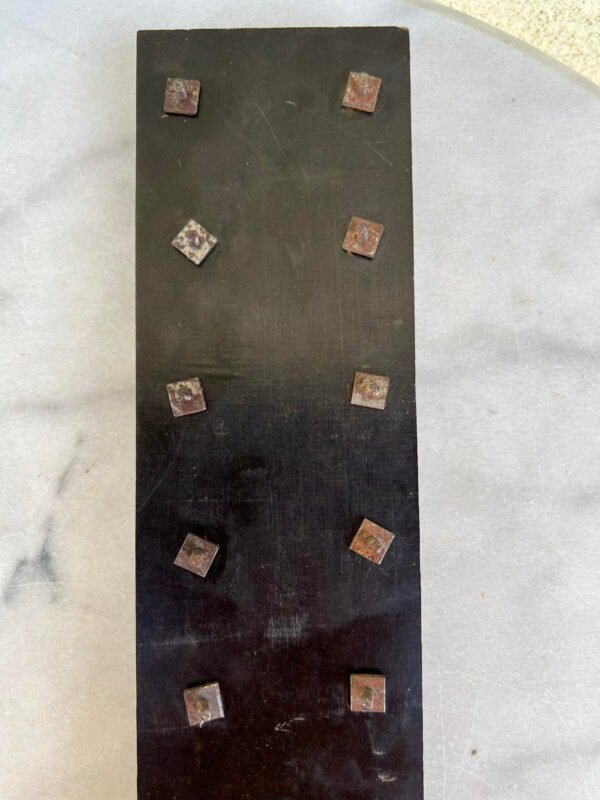 Rankenėlė masyvi, antikvarinė, bronzinė. Svoris 150 g. Ilgis 11, plotis 2, atstumas tarp varžtų 7,5 cm. Kaina 12