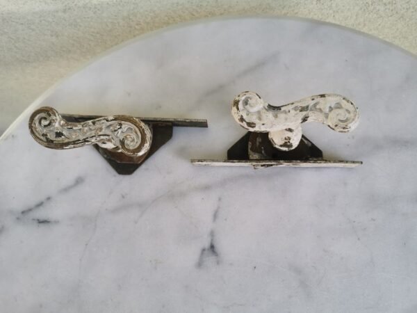 Rankenos antikvarinės, prancūziškos. Paris. E. Muller. Deposee. 2 vnt. Rankenų plotis 16 cm. Pagrindo aukštis 10, plotis 6 cm. Ilgis tarp viršutinės tvirtinimo skylės 10 cm. Kaina po 63