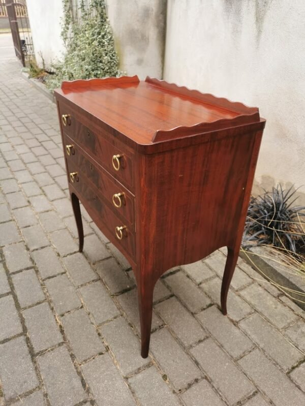 Spintelė, komoda stalo įrankiams, 4 stalčių, raudonmedžio spalvos, antikvarinio stiliaus. Aukštis 73, ilgis 48, gylis 34 cm. Kaina 116