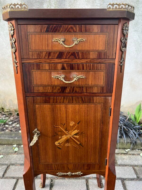 Komoda, spintelė nedidelė, akmeniniu stalviršiu, puošta bronza. Aukštis 69, plotis 51, gylis 31 cm. Kaina 162