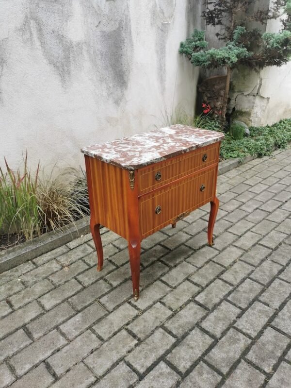 Komoda rausvo marmuro stalviršiu, puošta bronza, rakinama, antikvarinė. Aukštis 72, ilgis 79, plotis 41 cm. Kaina 287