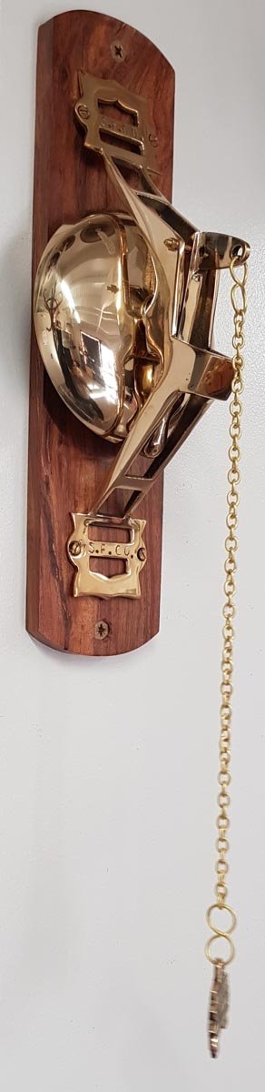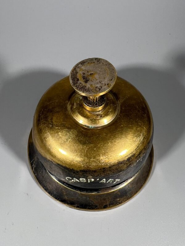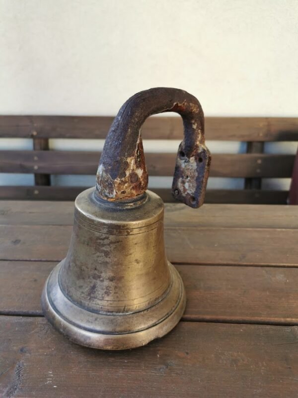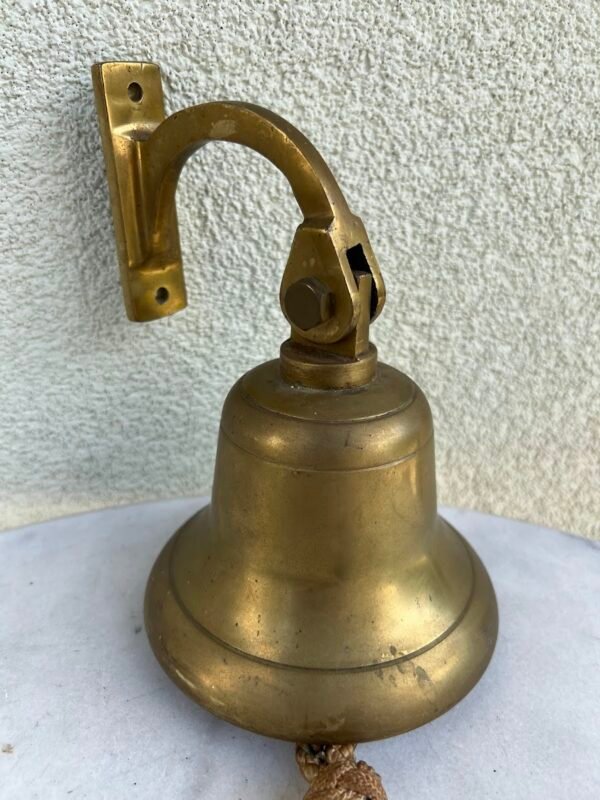 Varpas jūrinis, žalvarinis, šturvalo formos laikikliu. Nenaudotas. Varpo skersmuo 12, varpo aukštis 16, viso įrenginio aukštis 21, laikiklio šturvalo plotis 16 cm. Kaina 78