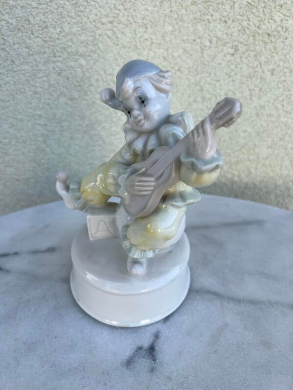Statulėlė grojanti, porcelianinė Grojantis klounas, juokdarys, muzikinė dėžutė. Melodija: Send in the clowns. Aukštis 18, pagrindo skersmuo 10 cm. Kaina 83