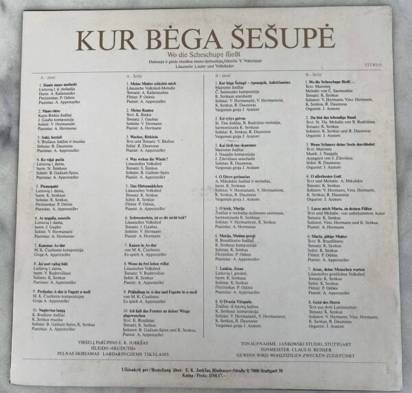 Plokštelė vinilinė LP lietuvių išeivijos Kur Bėga Šešupė, Muzikos Meno Darbuotojų Būrelis V. Vokietijoje. Artwork – E. K. Jurkšas. Išleido Skudutis. Kaina 23
