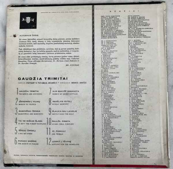 Plokštelė vinilinė LP lietuvių išeivijos Lietuviški maršai, Gaudžia Trimitai, Bronius Jonušas, 1959 m. Manufactured By – RCA Victor Custom Records. Music By, Conductor – Bronius Jonušas Orchestra – Stuttgart’o Pučiamųjų Ansamblis. Išleido Pasaulio lietuvių bendruomenės Vokietijos krašto valdyba ir autorius. Kaina 28