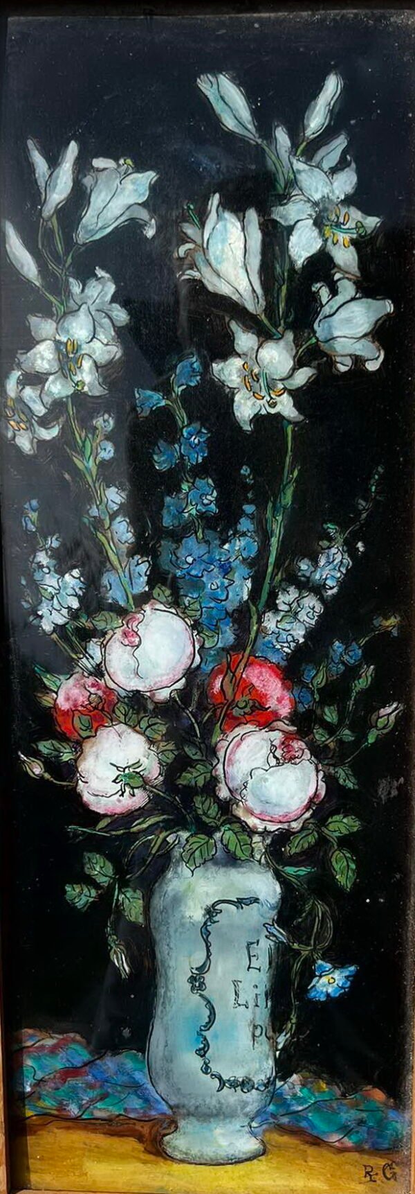 Paveikslas Gėlės, antikvarinis, prancūziškas. Atvirkštinio tapymo ant stiklo technika. Išorinis dydis: 14 x 42 cm. Kaina 87