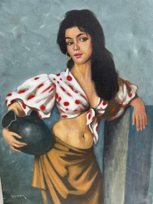Paveikslas Moteris su ąsočiu. Drobė, aliejus. Orientalistinis stilius, antikvarinis. Išorinis medinio rėmo dydis: 43 x 64 cm. Kaina 73