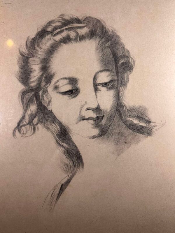 Paveikslas graviūra antikvarinė Jaunos moters portretas. P. Dethier. Pieštukas, popierius, signatūra P. Dethier, 1876 m. Dydis: 21 x 29 cm. Kaina 63