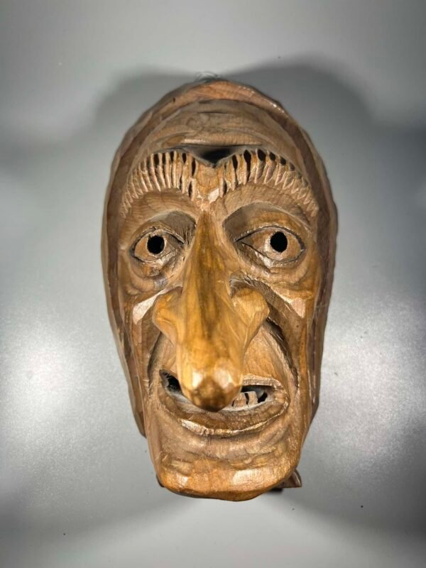 Kaukė medinė, drožinys Ragana. Aukštis 25, plotis 14 cm. Kaina 73