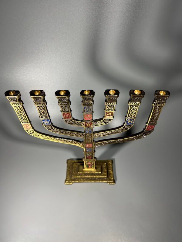 Menora žvakidė žalvarinė, Jerusalem, Jeruzalės suvenyras, septynšakė, judaikos stilius, Izraelis. Aukštis 27, plotis 22 cm. Kaina 87