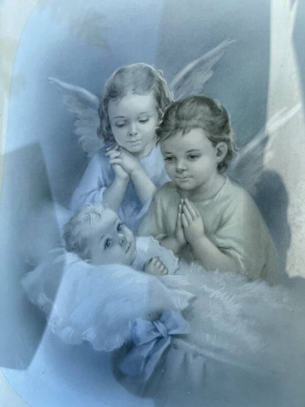 Paveikslas, Angelai meldžiasi prie kūdikio, litografija antikvarinis, išgaubtu stiklu. Dydis: 23 x 29 cm. Kaina 48