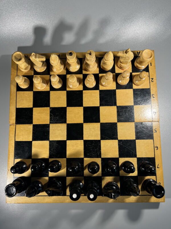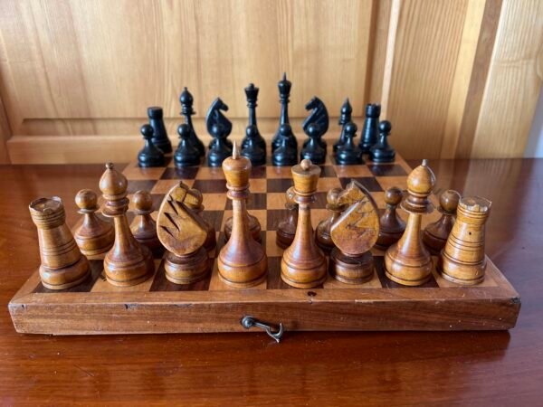Šachmatai mediniai su medine šachmatų lenta, komplektas, tarybiniai, sovietinių laikų. Kaina 57