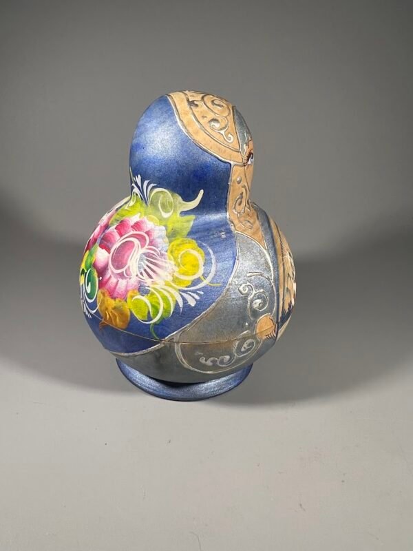 Tai vintažinis porcelianas, dekoruotas rankomis tapytais kobalto mėlynumo žiedais, auksu ir ryškiomis oranžinėmis detalėmis.