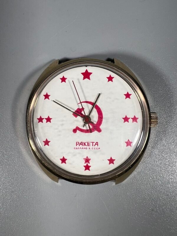 Laikrodis mechaninis Raketa, Ракета auksuotas, su dokumentais ir dėžute, kolekcinis, sovietinis, tarybinių laikų su sovietine simbolika. Veikiantis. Kaina 128