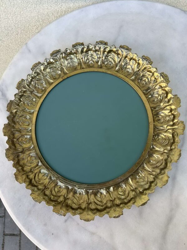 Veidrodis, padėklas metaliniame rėme, apvalus. Rėmo išorinis skersmuo 36 cm. Kaina 58