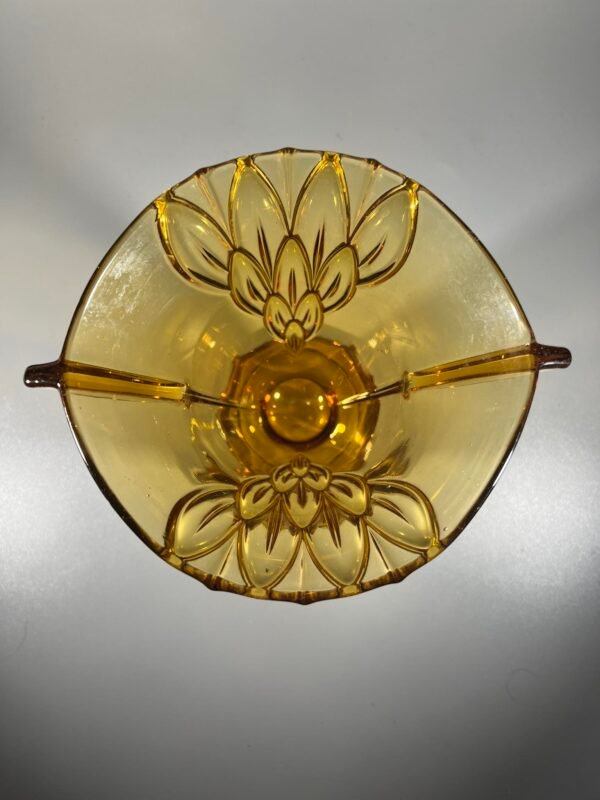 Vaza Art Deco stiliaus, gintaro spalvos presuoto stiklo, antikvarinė, tarpukario laikų. Čekoslovakija. 1930 m. Pagaminta Austrijos fabrike Stölzle Čekoslovakijoje 1930 m. Aukštis 15 cm. Kaina 53