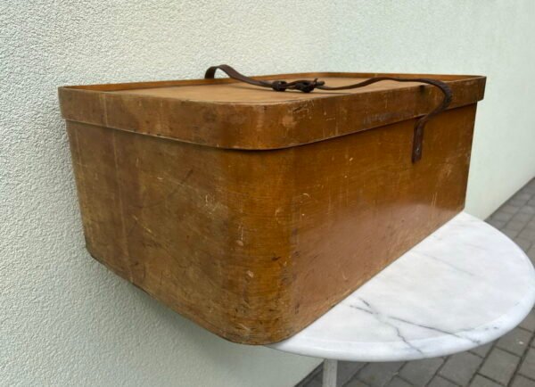Skrybėlių dėžė, lagaminas antikvarinis, beržo faneros, fanerinis, odiniu diržu. LUTERMA Grand Prix Paris 1900. Pagaminta Luterma Reval, iki 1910 m. Tinkama naudojimui. Ilgis 66, plotis 27, aukštis 27 cm. Kaina 223