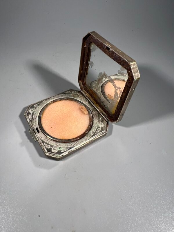 Pudrinė su veidrodėliu, sidabrinė, antikvarinė, aštuonkampė, pudros kompaktinė dėžutė. Svoris 55 g. Praba 875. 1922-1924 m. Dydis: 1 x 6,5 x 6,2 cm. Kaina 118