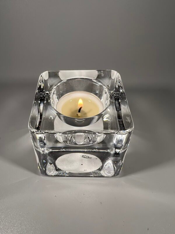 Žvakidė presuoto stiklo, Orrefors Sweden. Aukštis 7, dydis: 7 x 7 cm. Kaina 23