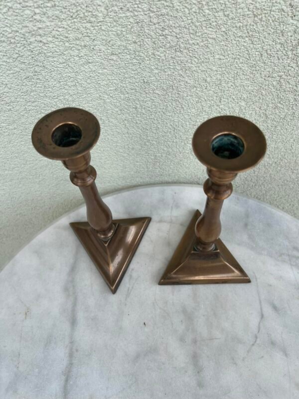 Žvakidės antikvarinės reguliuojamo žvakių aukščio, bronzinės. Vnt. svoris 500 g. 2 vnt. Aukštis 18, pagrindo skersmuo 9,5 cm. Kaina po 43