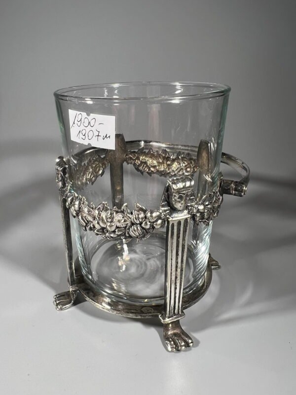 Indas antikvarinis, sidabruotas M & Co, Marples & Co of Sheffield. 1900 – 1907 m. Anglija. Puoštas Egipto faraono galvomis. Aukštis su rankena 15, skersmuo tarp kojelų 10 cm. Gali būti naidojamas kaip indas, pieštukinė, vazelė ar pan. Kaina 46