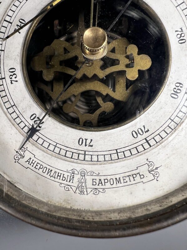 Aneroidinis barometras antikvarinis, carinės Rusijos laikų, pakabinamas. Netikrintas. Skilęs stiklas. Skersmuo 11, storis 5 cm. Kaina 138