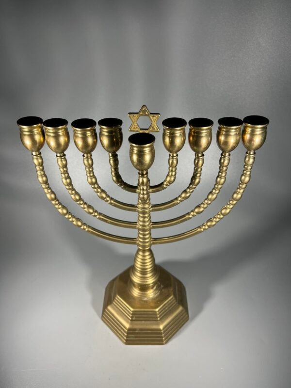 Žvakidė chanukija, šventinė menora, devynšakė, bronzinė. Svoris 1,3 kg. Aukštis 30, plotis 22 cm. Kaina 163