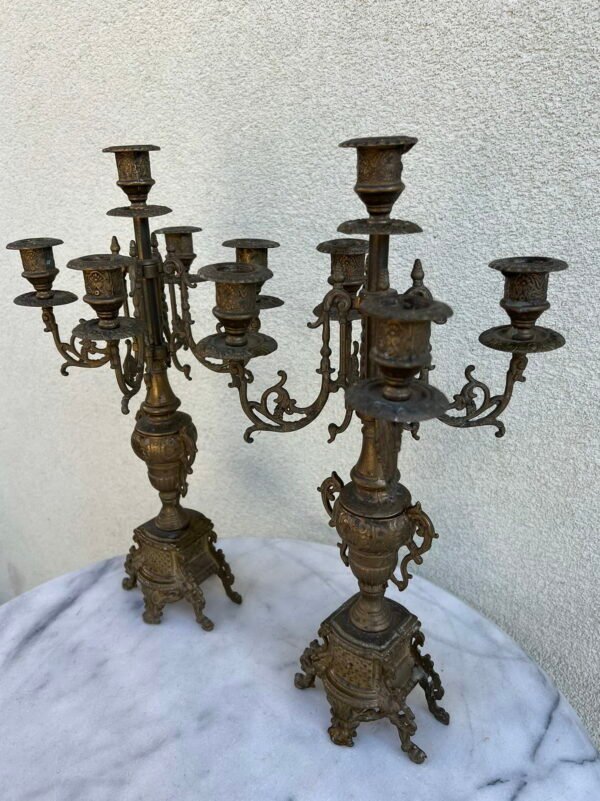 Žvakidės bronzinės, prancūziškos, antikvarinės. Vienos svoris 2,3 kg. 2 vnt. Aukštis 43, skersmuo 23 cm. Kaina po 93