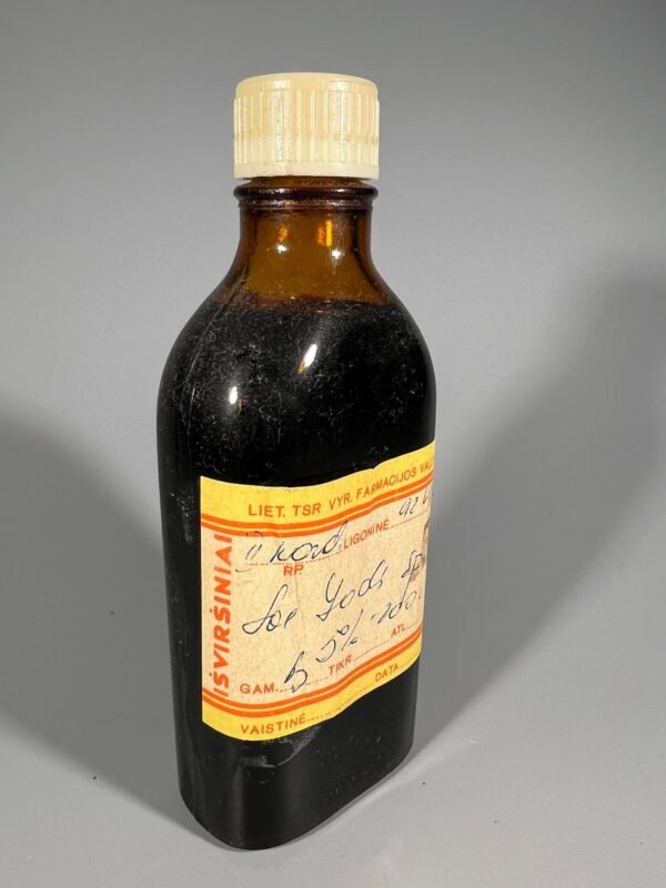 Vaistų buteliukas antikvarinis Jodo tirpalas. Nenaudota. Aukštis 15 cm. Kaina 13