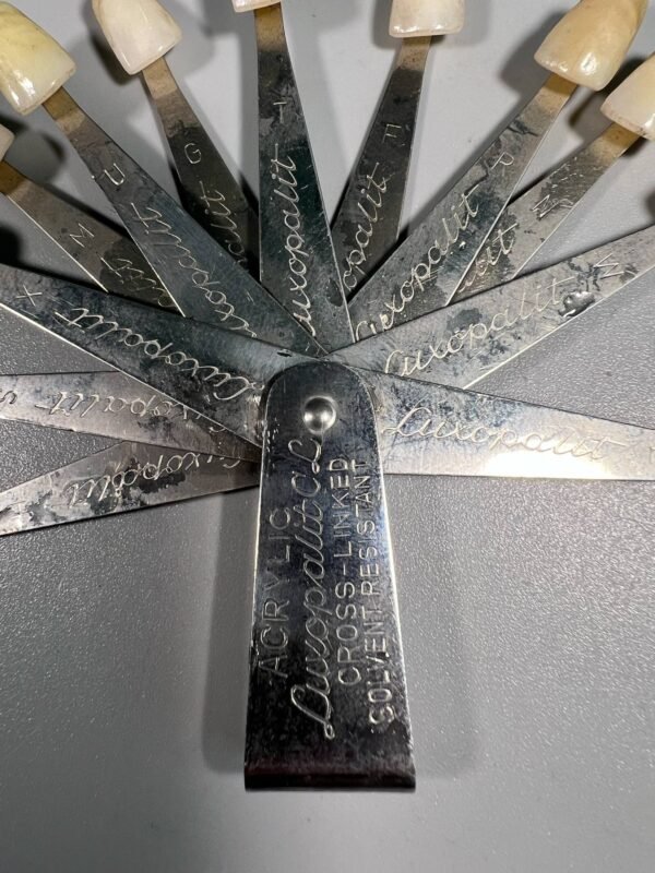 Dantų spalvų paletė (atspalvių rinkinys), antikvarinė, odontologinė, vokiška ZAHNFABRIK BAD NAUHEIM K.G. BAD NAUHEIM/GERMANY. LUXOPAL. 1950-1970 m. Dydis: 8 x 11 cm. Kaina 48