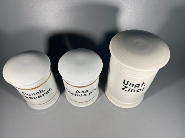 Indas vaistinės, vaistų, medicininis, porcelianinis, antikvarinis, tarpukario laikų. Vokietija. Dviejų mažesnių aukštis 11, skersmuo 8 cm. 3 vnt. Kaina po 53