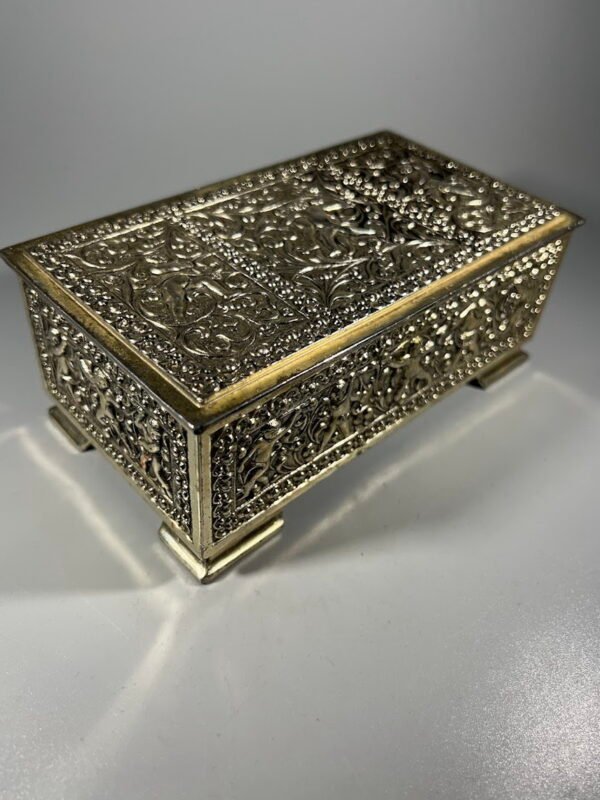 Dėžutė sidabruota, su sudėtingais, gėlių ir augalų motyvais bei putti (angelų) figūromis, būdingais Art Nouveau stiliui.
