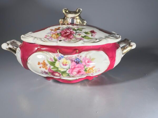 Dėžutė, bonbonjerė, cukrinė porcelianinė, neorokoko stiliaus, su gėlių dekoracijomis ir auksavimu. Aukštis su dangteliu 10 cm., aukštis be dangtelio 6 cm., ilgis: 19 cm., plotis: 11,3 cm. Kaina 28