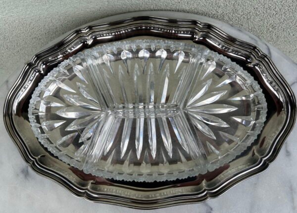 Padėklas serviravimo su stikliniais indais, antikvarinis. Ilgis 40, plotis 27 cm. Vienas stiklas įtrūkęs. Kaina 23