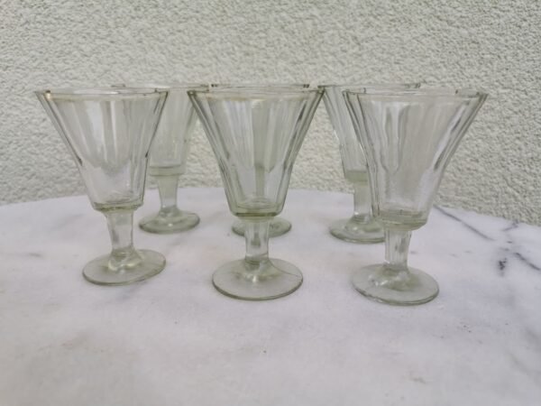 Stikliukai, taurelės ankstyvo pokario. LIKO 5 vnt. Aukštis 10, viršutinis skersmuo 6, pagrindo skersmuo 4,5 cm. Kaina po 8