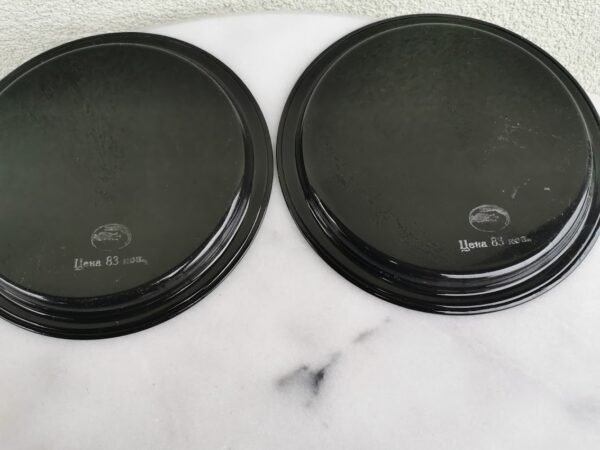 Lėkštės skardinės, tapytos, tarybinių laikų. 2 vnt. Skersmuo 18 cm. Kaina po 12