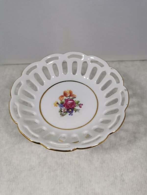 Lėkštė, dubenėlis porcelianinis, antikvarinis, ažūriniais kraštais. Aukštis 5, skersmuo 17 cm. Kaina 12