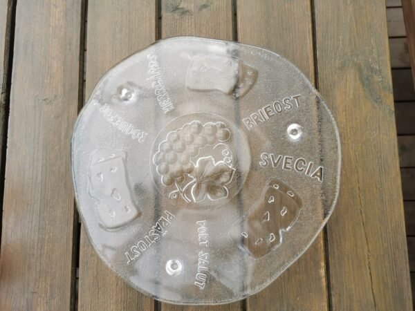Padėklas sūriui, stiklinis, vintažinis. Skersmuo 32 cm. Aukštis 2 cm. Kaina 21