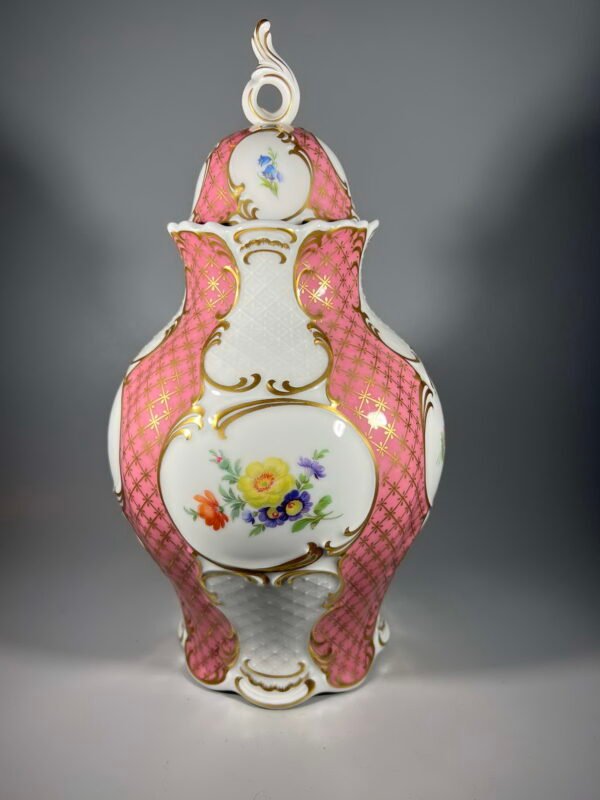 Vaza, urna porcelianinė vintažinė, vokiška, tapyta LINDNER KUEPS BAVARIA Prinzess Rose. Aukštis viso 28, skersmuo 16 cm. Kaina 88